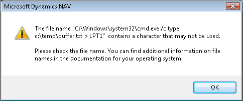 The file name “C:\Windows\system32\cmd.exe /c type c:\temp\buffer.txt > LPT1" contains a character that may not be used